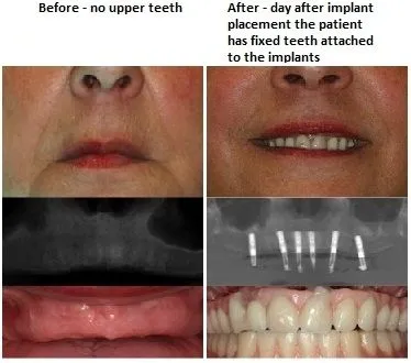 Teeth in a day" is an established treatment modality with a well documented success rate of over 95%. Traditionally, after a dental implant is placed, there is a 2-4 month waiting period prior to proceeding with the placement of the restoration to allow for the surrounding bone to attach to the implant (osseointegration). "Teeth in a day" technique implants are restored with a temporary or sometimes final restoration at the time of placement (to be more precise - within 48 hours from the placement of the implant). This technique is safe and predictable in select cases. The main benefit is avoiding the phase of having an edentulous area while waiting for the implant to integrate. Certain criteria are required to be able to apply this technique to an individual case. After the initial evaluation, Dr. Pritsky will discuss with you the option of having "Teeth in a Day" if your case is appropriate.